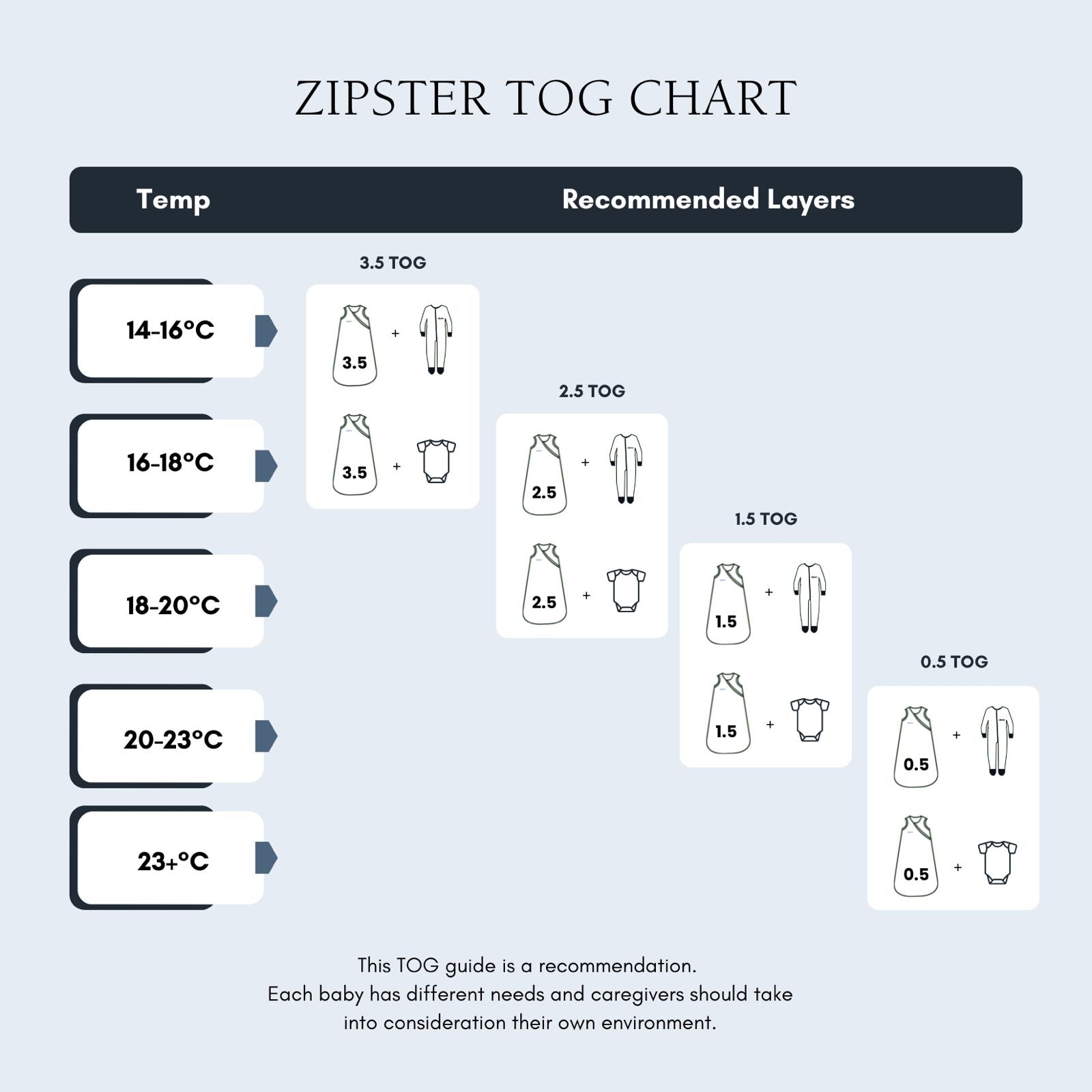 Depending on the temperature and your child's sleeping environment and preferences, we have 1.5 and 2.5 TOG to choose from